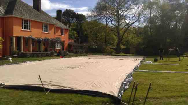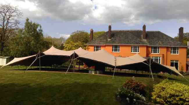 An image from the day of the build for a 50th Birthday party celebration in Abbots Leigh just outside the City of Bristol. For more images of the finished tent click the link below. The completed sand coloured stretch tent looked amazing against the back drop of simons vividly painted orange house. Happy Birthday Simon.